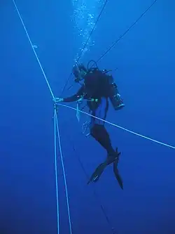 Weighted downlines are commonly used to provide a stable vertical reference. These may be tied to the boat or supported by a buoy. Each diver may be attached to a downline using a shorter tether to ensure that divers do not go too far from the boat or too deep.[11] The downline may be marked with lights to indicate depth and to attract mobile organisms.[10] A wide range of animal life may be seen, including many species that spend the daylight hours at depths below those accessible to ambient pressure divers, and migrate vertically through the water column on a diurnal cycle.[9] Many of these are bioluminescent or translucent or both.[10]