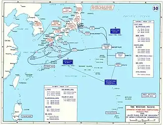Operation Downfall was the proposed Allied plan for the invasion of the Japanese home islands near the end of World War II. It was canceled when Japan surrendered following the atomic bombings of Hiroshima and Nagasaki, the Soviet declaration of war, and the invasion of Manchuria.[1]