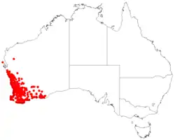 It is found in Beard's provinces of Eremaean Province and the South-West Province, or the later classification of IBRA regions of Avon Wheatbelt, Coolgardie (biogeographic region), Esperance Plains, Gascoyne, Geraldton Sandplains, Jarrah Forest, Mallee (biogeographic region), Murchison (biogeographic region), Swan Coastal Plain, Warren and Yalgoo (biogeographic region).[5]