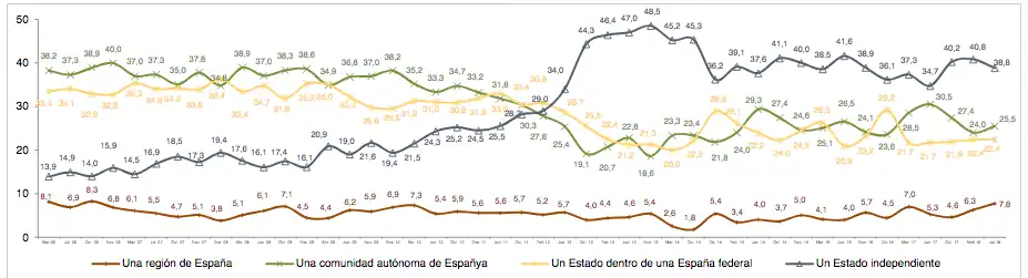 In addition, CEO performs regular polls studying opinion of Catalan citizens regarding Catalonia's political status within Spain. The following table contains the answers to the question "Which kind of political entity should Catalonia be with respect to Spain?":[27]