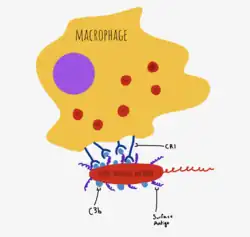 The complement system, independently of the adaptive immune response, is able to opsonize pathogens before adaptive immunity may even be required.[4] Complement proteins involved in innate opsonization include C4b, C3b and iC3b.[7] In the alternative pathway of complement activation, circulating C3b is deposited directly onto antigens with particular PAMPs, such as lipopolysaccharides on gram-negative bacteria.[7] C3b is recognized by CR1 on phagocytes. iC3b attaches to apoptotic cells and bodies and facilitates clearance of dead cells and remnants without initiating inflammatory pathways, through interaction with CR3 and CR4 on phagocytes.[4]