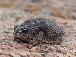 The orange-crowned toadlet (Pseudophryne occidentalis), or western toadlet, is a species of frog in the family Myobatrachidae. It is endemic to Australia. Its natural habitats are temperate shrubland, Mediterranean-type shrubby vegetation, intermittent rivers, intermittent freshwater lakes, freshwater marshes, intermittent freshwater marshes, and rocky areas.