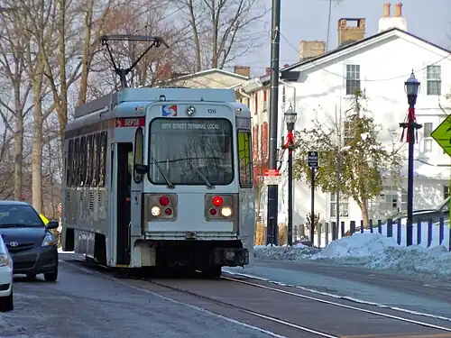 Orange Street/Media station is a light rail station in Media, Pennsylvania. It is a street running stop located at Orange and State Streets in Downtown Media. There are no physical platforms; passengers board and exit trolleys directly from street level. Trolley service is provided by the D and runs east to 69th Street Transit Center in Upper Darby. Orange Street is the westernmost station on the line, and is unusual in that the tracks simply and abruptly dead-end in the middle of the street; there is no bumper block, balloon loop, or train yard at this location although an overhead wire device will knock down the trolleys' overhead pantograph so that they cannot continue past the end of track (although some cars have slightly derailed there and gouge marks are evident in the asphalt).