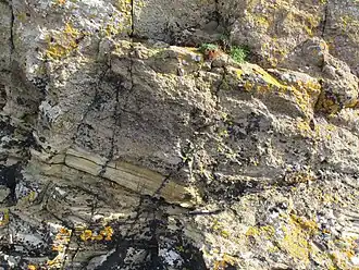 The landscape consisted of rounded hills formed of older metamorphic and igneous rock. The lakes varied in depth and extent from time to time, sometimes lapping against the side of the hills and sometimes retreating so that river flood plains were able to form.[20] Stromatolites can be found at Stromness, indicating that the lake was sometimes saline. Locally scolecodonts (marine microfossils) have been found in the Eday Marl suggesting at least a temporary connection to the sea.[16] The hills were bare of vegetation.[20] The land was not colonised by large plants as it is today, so erosion would therefore be rather rapid and probably seasonal, as would be lake productivity. This is reflected in the deep lake carbonates, which show very fine laminations, interpreted as varves.[21]
