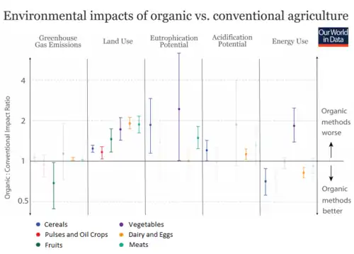 A 2021 meta-analysis reported (i) a 14% lower productivity in organic dairy cattle, (ii) an 11% lower feed-use efficiency in organic dairy cattle and an 89% lower in poultry broilers, and (iii) reduced competition between feed and food use in organic dairy systems.[6]