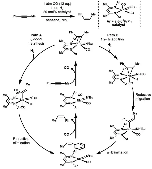 An organoniobium catalyst has also been developed for (Z)-selective semihydrogenation of alkynes. The mechanistic pathway for this reaction is distinct from other transition metal catalyzed hydrogenations, proceeding through the Nb(V) metallocyclopropene which engages with hydrogen either through direct sigma-bond metathesis or outer sphere 1,2-addition.[11]