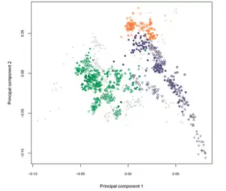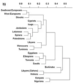 A 2013 study by Badro et al. analyzed haplogroups of modern Palestinians as well as other groups from the Middle East. The study found that mtDNA distribution of Palestinians, Lebanese, Jordanians, and Syrians clustered together separate from Yemenis, Saudis, and Egyptians, and that the Arabian peninsula population clusters were differentiated from Levantine populations.[41]