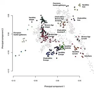 A 2017 review article found that early farming populations in the Levant, Iran, and Anatolia have significantly influenced modern-day Western Asian genomes.[29] A 2023 study, which looked at the whole genomes of modern-day ethnic groups around the world, found that the Palestinian samples clustered in the "Middle Eastern genomic group". This group included samples from populations such as Samaritans, Bedouins, Jordanians, Iraqi Jews and Yemenite Jews.[22]