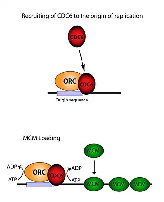 - ^ Randell JC, Bowers JL, Rodríguez HK, Bell SP (January 2006). "Sequential ATP hydrolysis by Cdc6 and ORC directs loading of the Mcm2-7 helicase". Molecular Cell. 21 (1): 29–39. doi:10.1016/j.molcel.2005.11.023. PMID 16387651.
