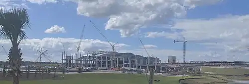 The facility mostly reuses plans from the proposed Florida High Speed Rail system. In that plan, the Orlando International Airport station was to be the northern terminus of the initial Tampa-to-Orlando route along Interstate 4. The plan was effectively cancelled when Florida governor Rick Scott announced he would reject federal funding for the project. The Greater Orlando Aviation Authority had already invested considerably in improvements to accommodate the station and high-speed rail line, such as the extra length of the south taxiway bridges over the southern airport access road, which is now used by Brightline.[4] As part of the $684 million intermodal complex, the airport authority has also built a 2,400 space parking garage.[3][1]