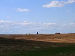 Unreclaimed wells are inactive wells that may be orphaned or legally-licensed. Some unreclaimed wells may have been sealed off, while some have begun or completed remediation or reclamation of the well site. Under current AER regulations, it is legal for operators to leave well reclamation suspended indefinitely, this is not the case in some oil producing states, such as North Dakota.[25][26] Daryl Bennett, who represents landowners through both My Landman Group and Action Surface Rights "in disputes involving resource companies",[27] said that there were 170,000 unreclaimed sites that require cleaning.[28] These unreclaimed wells were licensed by the province to oil and gas operators under Alberta's mineral rights provision, by which landowners only have surface—not below the surface mineral rights—and have no right of refusal to prevent a well being drilled on their property.[22][27][29][30] When the wells were producing, landowners benefitted, as operators pay an annual fee to lease and access the site. When operators go bankrupt or simply cannot be relocated, landowners are left with these aging wells with no recourse. By 2001, there were about 59,000 farms with at least one well on their property.[31] By 2023, wells and pumpjacks dot the landscape across much of rural Alberta with a well for almost every 1.4 km2 (0.54 sq mi).[25][26][32]