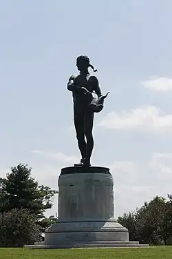 The monument consists of a 24-foot (7.3 m) bronze statue of Orpheus atop a 15-foot (4.6 m) round marble base.[2][1] Orpheus is nude, save for a headband and a fig leaf,[4] and he is playing a five-stringed tortoise shell lyre.[2] Orpheus's design is an example of the neoclassical sculpture designs that were popular during the time of its creation.[1] On the base of the monument, which has a diameter of 30 feet (9.1 m),[8] is a medallion honoring Key,[2][5] who is depicted in profile.[1] This medallion is supported on either side by a soldier and a sailor in low relief, while the rest of the base depicts the Muses celebrating the U.S. Army and the U.S. Navy.[1] Along the base, an inscription reads: "To Francis Scott Key - Author of the Star Spangled Banner and to the soldiers and sailors who took part in the Battle of North Point and the defense of Fort McHenry in the War of 1812."[2]