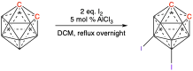 For example, the boron vertices at the 9 and 12 positions opposite to the carbon vertices can be iodinated using iodine and a catalytic amount of AlCl3 while in refluxing dichloromethane.[12]
