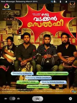Oru Vadakkan Selfie (transl. A Northern selfie) is a 2015 Indian Malayalam-language black comedy film directed by G. Prajith and scripted by Vineeth Sreenivasan.[5] The film features Nivin Pauly, Manjima Mohan, Aju Varghese, Neeraj Madhav, and Vineeth Sreenivasan.[6][7] The music was composed by Shaan Rahman. It was released on 27 March to positive reviews,[8] and became one of the biggest grossing Malayalam films of the year. Some news media and the Kerala Film Producers Association called it the first successful Malayalam film of 2015. This movie marks the debut of Manjima Mohan as an actress in a Malayalam movie. Earlier, she appeared as a child artist in films, including Priyam and Sundara Purushan. The film was remade in Telugu as Meda Meeda Abbayi.