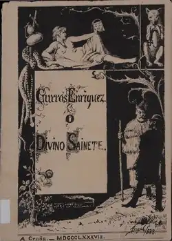 Galician humor and satire have a long tradition, from sneering medieval poems to modern-day comics (the first Galician comic strips are published in 1888[42] and in the first decades of the 20th century drawing was analysis tool in the key of socio-political criticism or charge). Authors like Risco[43] and Otero Pedrayo, who portrayed Diego Gelmires as a comedian, used satire to comment on Galician society. Pioneers of puppetry like Barriga Verde reflected with humor the quarrels between Galicians and Portuguese, as Gabriel Feijóo had done centuries before. Artists like Maside and Díaz drew inspiration from illustrations and caricatures of Central European humor. Castelao and Luis Bagaría (although Catalan by birth, he was a close friend of a lot of Galician artists)[44][45] were two of the most influential graphic humorists in Galicia,[46][47][48] and Vázquez Díaz combined classic portraits in sculpture with satire in his penguin, closely linked to surrealism, for which he suffered censorship.[49]