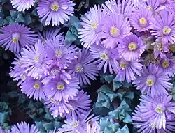 This intensely flowering plant is found growing among sandstone rocks in the winter-rainfall mountains of the far south-western corner of South Africa. Growing to 30 cm (12 in) high and spreading indefinitely,[3] it has silver-blue foliage. The fat, succulent leaves are three-sided (hence the qualifier deltoides – "triangular"),[4] with red teeth on the margins. The stems are often tinged purple.