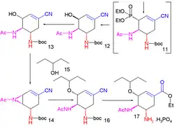 - ^ a b c d Ishikawa, Hayato; Suzuki, Takaki; Hayashi, Yujiro (2009-02-02). "High-Yielding Synthesis of the Anti-Influenza Neuramidase Inhibitor (−)-Oseltamivir by Three "One-Pot" Operations". Angewandte Chemie International Edition. 48 (7): 1304–1307. doi:10.1002/anie.200804883. ISSN 1521-3773. PMID 19123206.