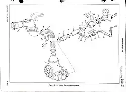 The Oshkosh MB-5 was built with a turbocharged Caterpillar 1673 diesel engine, which outputs to a Twin Disk TD-41-1112 4-speed "Power shift" Semi-automatic transmission.[2] Gears were selected using a simple stick mounted to the right of the driver's seat, and were arranged sequentially. They were labeled in order, using a sticker with R N 1 2 3 4 to represent gears.[3] The selector had notches where the stick would sit, with one between every other selection. This required the operator to rotate the stick out of the selected gear, similar to how a conventional manual transmission requires the driver to move the stick in and out of the desired gear's location. The main difference was that the action of moving the stick out had no mechanical effect on the transmission, as the notches only served to prevent the operator from accidentally over-shifting if they weren't looking at the gear selector. The transmission used a multi-clutch system, with one clutch for every selectable gear. This allowed a selection to be made while the engine still gave power meaning drivers could shift without letting go of the gas.[3]