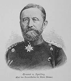 Sperling entered the Prussian Army in 1832 as an officer candidate in the 31st Infantry Regiment. In 1835, Sperling was appointed as Second lieutenant. Between 1838 and 1841 he was a student at the Prussian Staff College. Afterwards he served as an adjutant in the Topographical Department of the Prussian General Staff. Then, as an adjutant in the 29th Infantry Regiment, Sperling participated in the suppression of the Baden Revolution. Promoted to captain on 16 November 1852, he remained in the 15th Division as an adjutant until April 1857. He then briefly served as company commander in the 32nd Infantry Regiment before returning to the general staff in January 1858, with a promotion to major. In 1860 he was sent to Italy as a military obeserver, where he attended the Siege of Gaeta. On 18 October 1861, by now having returned to Prussia, Sperling was promoted to Oberstleutnant. In March 1863 he became Chief of Staff of the VI Corps, which was stationed at Breslau. In this position Sperling participated in the Second Schleswig War.[2] On 18 June 1865 Sperling was promoted to Oberst. In the same year Helmuth von Moltke, the Chief of the General Staff, wrote in his assessment that von Sperrling was a highly talented officer.