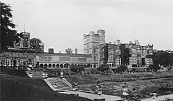 Osmaston Manor was designed by Henry Isaac Stevens for Francis Wright of the Butterley Iron Company and completed in 1849. Many aspects of the Manor's design mirrored Tissington Hall, the home of Wright's wife's family, the FitzHerberts. Upon completion, Wright moved into the house with his family, and lived there until his death in 1873, when it was passed to his eldest son, John.[3] Because of financial difficulties, the estate was sold in 1888 to Sir Andrew Walker's family, who had the house demolished when they moved to Okeover and adopted the Okeover name. The house was used as a Red Cross hospital during World War II,[4] and demolished in 1964.[3] The Walker-Okeover family still own the land; the estate hosts horse trials and the Ashbourne Shire Horse Show.[3] The terraces of the house's gardens are still apparent today.