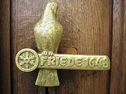 The Friedensaal is located a few metres behind the entrance door to the left; directly opposite is the town hall treasury. A variety of precious items is stored and displayed here, among them the civic silver, coins, embossing stamps and various documents. Particularly noteworthy items are the valuable imperial goblet from the 13th/14th century and Osnabrück's oldest skirmish line. In addition there are documents of historical significance on display, including a replica of the Peace of Westphalia – the "Osnabrücker Friedensinstrument" (Osnabrück Instrument of Peace) – along with a copy of the document with which Emperor Frederick Barbarossa granted the people of Osnabrück the right to exercise their own jurisdiction in 1171.
