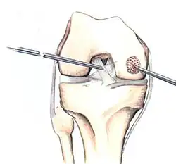 In attempts to address the weaker structure of the reparative fibrocartilage, new techniques have been designed to fill the defect with tissue that more closely simulates normal hyaline articular cartilage. One such technique is autologous chondrocyte implantation (ACI), which is useful for large, isolated femoral defects in younger people. In this surgery, chondrocytes are arthroscopically extracted from the intercondylar notch of the articular surface. The chondrocytes are grown and injected into the defect under a periosteal patch. ACI surgery has reported good to excellent results for reduced swelling, pain and locking in clinical follow-up examinations.[58][59] Some physicians preferred to use undifferentiated pluripotential cells, such as periosteal cells and bone marrow stem cells, as opposed to chondrocytes. These too have demonstrated the ability to regenerate both the cartilage and the underlying subchondral bone.[60]
