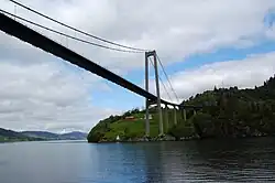 The Osterøy Bridge (Norwegian: Osterøybrua) is a suspension bridge in Vestland county, Norway. The bridge connects the Kvisti farm area on the island of Osterøy in Osterøy Municipality with the Herland farm area on the mainland in Bergen Municipality east of the city of Bergen. The bridge is the third largest suspension bridge in Norway. It is part of Norwegian County Road 566 (Fylkesvei 566).[1]