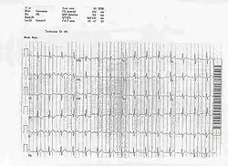 Patients with atrial Septal Defects may have atrial fibrillation, atrial tachycardia, or atrial flutter, but these abnormal heart rhythms are not usually seen until the affected individual grows older. Features also seen on the ECG include right atrial enlargement and varying degrees of atrioventricular block. When a person is suspected of having an ASD based on the findings of an incomplete right bundle branch block with a rSr' or rSR', the frontal plane QRS should be examined. The frontal plane QRS is the most helpful clue to distinguish between an ostium secundum ASD and an ostium primum ASD. In primum defects left axis deviation is seen in most patients with an axis of > -30 degrees and very few patients have right axis deviation. In contrast ostium secundum defects have an axis between 0 degrees and 180 degrees with most cases to the right of 100 degrees.
