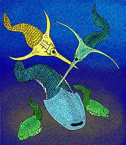 Anaspida ('no-shields') is an extinct group of primitive jawless vertebrates that lived during the Silurian and Devonian periods.[17] Anaspids were small marine agnathans that lacked heavy bony shield and paired fins, but have a striking highly hypocercal tail. They first appeared in the Early Silurian, and flourished until the Late Devonian extinction,[18] where most species, save for lampreys, became extinct due to the environmental upheaval during that time. | |