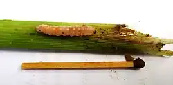 The Asian corn borer goes through six instar stages while in the larval phase.[5] The first-instar larva is pinkish with dark spots and a dark head. The late instar larva is yellow brown with dark spots and reaches up to 2.9 centimeters in length.[6]