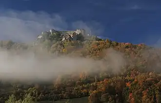 The Ostrovica Castle (Bosnian: Stari grad Ostrovica, Ottoman Turkish: Ostroviçe kalesi) is a large medieval structure situated above the small village of Ostrovica near Kulen Vakuf, Bihać municipality, Bosnia and Herzegovina. Having been built on a heavily wooded ridge of a steep hill overlooking left bank of the shallow Una river, the castle was located on a strategic site connecting the northern and southern parts of the long Una valley.
