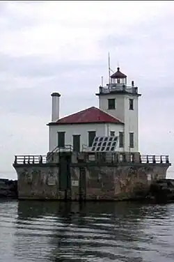 Oswego Harbor West Pierhead Lighthouse is an active aid to navigation located off the coast of Oswego, New York.[2][3] It was built in 1934 to replace an earlier light constructed in 1880. It stands at the end of a 2,000-foot-long (610 m) breakwater at mouth of Oswego River, extending one-half mile (0.80 km) out onto Lake Ontario. It is accessible by boat or from land over the abutting breakwater. It is open to the public for tours during the summer. It is owned by the City of Oswego and operated by the United States Coast Guard. It is listed on the National Register of Historic Places.