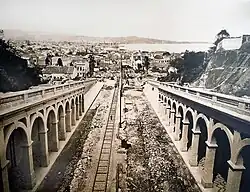 The origins of the viaduct date back to 1914, when the city's first general plan foresaw the opening of a street to connect the eastern, southern, and central zones of Porto Alegre, which until then were isolated by the so-called "morrinho".[1] However, its construction was only approved in 1926, when the intendant Otávio Rocha, together with the state president, Borges de Medeiros, determined the effective opening of the current Borges de Medeiros Avenue. Such decision required a downgrade on the ground, interrupting the course of the Duque de Caxias Street and forcing the creation of an elevated road to reconstitute its passage.[1]