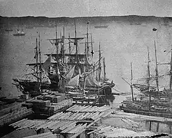 The industry came about just before[2] Napoleon's 1806 Continental Blockade in Europe, forcing the United Kingdom to require a new source for timber, especially for its navy and shipbuilding. Later, Britain's application of gradually increasing protectionist tariffs on non-Empire goods increased Canadian imports. Leading into the early 1800s much of the pine in New Brunswick had been cut and Ottawa-Gatineau was considered the boundary for lumbering. Moving to the mid 1800s much of the pine in this once pristine area was now cut.[3] The first part of the industry, the trade in squared timber lasted until about the 1850s. The transportation for the raw timber was first by means of floating down the Ottawa River, first conducted in 1806 by Philemon Wright in Wright's Town.[4] Squared timber would be assembled into large rafts which held living quarters for men on their six-week journey to Quebec City, which had large exporting facilities and easy access to the Atlantic Ocean.[5]