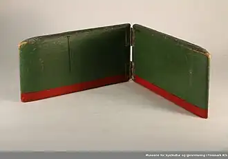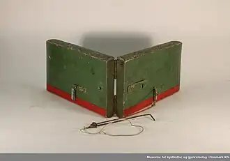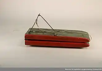 The otter is a fishing device constructed with two parts, an otter board and a fishing line. It is steered by pulling on the line then letting stack so the slide mechanism on the board operates to switch direction. It may be used from a boat or pulled from the shore. It is very difficult to retrieve from a boat once fish are on. The board steers away from shore when the line is pulled and positioned by giving more or less line out. The board will travel parallel to the line of travel of the fisherman. It was introduced into Norway by British anglers sometime around the middle of the nineteenth century. The first account of such a device is found in connection with Irish sports fishermen in 1855.[1][2]