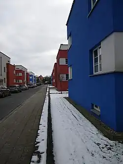 It was only with the florally named "Blumläger Field Settlement" ("Siedlung Blumläger Feld") of 1930/31 that it became possible to apply the planned rents.[5] An unusual feature of this development was that each residential unit was assigned its own tenants' garden, directly accessible at the ground floor level. The incorporation of gardens gives the development a "garden city" character.[5] The settlement was partly torn down in 2003, but the second phase, on the north side of the "Galgenberg" Street, remains fully preserved from that redevelopment.[7]