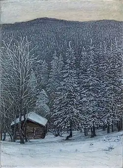 He left the Academy in 1895 and, the following year, one of his works was exhibited in Berlin. His first major showing was at the General Art and Industrial Exposition of Stockholm in 1897. This was followed by exhibits in Venice (1901), Budapest, Paris (1906) and Vienna. By 1906, he was able to afford his own villa at Säffle in Värmland. He died during 1913 at By parish in Värmland. In 1913, his widow donated many of his works to galleries in Sweden. Some were purchased by galleries in Venice and Vienna. In 1920, his gravesite at Ånimskog's cemetery was decorated with a medallion and bust, created by sculptor, Oscar Vitalis Gustafson (1888-1952). [6]