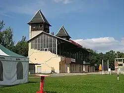 As part of the expansion of the Scheibenholz racecourse, which had existed since 1867, the existing wooden grandstand was to be replaced. Burghardt designed a massive grandstand building with two massive towers and a restaurant.[6]