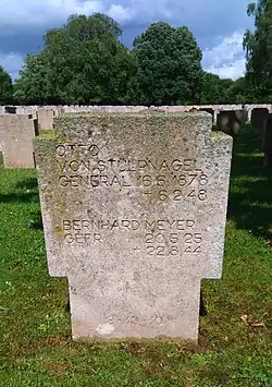 When arrested by British authorities in December 1946, Stülpnagel wounded himself with a pistol shot. He recovered and was transferred into French custody in a military prison. Charged with war crimes by the French authorities, Stülpnagel committed suicide by hanging himself in his cell in Cherche-Midi Prison on 6 February 1948.[3] He is buried in the Champigny-Saint-André German war cemetery.