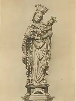 The star on Mary's robe alludes to her epithet of Stella Maris. -