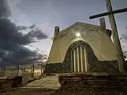 The reputation of the gold deposits on the margins of the Peixe River brought many adventurers to the Chapel of Rio do Peixe region who were responsible for building the Chapel of Saint Anne that, besides being the patron saint, was considered the owner of the place, showing the presence of Catholicism in a landscape where the houses or ranches were simple and small, made of wattle and daub technique, adobe, with a roof of buriti leaves with a ground floor, of one or two pitches and single storey.[22] The current one, the third one built, is located at the top of a square, a natural grassed elevated area, and has a facade with characteristics of the colonial period, formerly whitewashed and with turquoise blue frames, in a style that, at first, doesn't distinguish it from many others scattered throughout the recesses that sheltered populations in the Brazilian colonial period, and brings with it traits very characteristic of this period, such as having the local cemetery attached, being a great place of pilgrimage to the festivities celebrated there in July. In the mid-1980s, under the tutelage of the Goianésia Parish, the current temple underwent internal transformations, such as the removal of the original wood floor for a masonry and ceramic floor and lining with a plasterboard structure; two other rooms were added to the temple, one for the sacristy and the other to serve as the priests' dormitory during the festivities.[22]