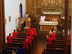 In October 1737, the Book of Deaths started to register deaths in Corumbá de Goiás, where the Chapel of Our Lady of Peñafrancia, inaugurated in 1734 and subordinated to the Rosary Parish, began to be attended by Father Antônio Soares.[1][9] The Chapel of Peñafrancia, elevated to the status of Mother Church in 1840, was the pioneer of the parishes of Abadiânia, Alexânia and Cocalzinho.[10][11][12] The Portuguese influence of the Our Lady of the Rosary Parish replicated the traditions of Pirenópolis in the Chapel of Peñafrancia in Corumbá, such as the Brotherhood of the Blessed Sacrament, Holy Week celebrations, Feast of Saint Sebastian, Feast of the Divine, Choir, Orchestra and band in the masses and processions, as well as the Cavalhadas, held in the city in September during the patron saint's feast.[9]