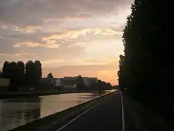 The Canal de l'Ourcq (French pronunciation: [kanal də luʁk]) is a 108.1 km (67.2 mi) long canal in the Île-de-France region (greater Paris) with 10 locks.[1] It was built at a width of 3.20 m (10.5 ft) but was enlarged to 3.7 m (12 ft), which permitted use by more pleasure boats.[1] The canal begins at Port-aux-Perches near the village of Troesnes, where it splits from the channeled river Ourcq, and flows to the Bassin de la Villette, where it joins the Canal Saint-Martin. Paris requires 380,000 cubic metres (84,000,000 imp gal; 100,000,000 US gal) of water daily for cleaning the sewer system, gutters, and parks.[1] The Canal de l'Ourcq provides about half of the requirement. Since 1983, the waterway has been designated for use by pleasure craft, and its water is designated for non-drinking uses.[2]
