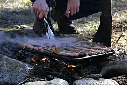 Backwood cooking is a method of cooking without the use of kitchen implements.[4] It commonly takes place in the backwoods, often in combination with wild or conventional camping. Some variants of backwoods cooking allow the use of items of cookware such as a cooking pot;[5] however there are many recipes without any. Some backwoods alternatives to cookware include aluminium foil,[4] fruit skins,[6] and heated stones.[7] Traditionally backwoods cooking takes place over a wood-burning fire because wood is the most available fuel source in the backwoods.[8] As a result, some recipes include information about the intensity of the fire to be used.[6]