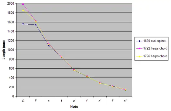 The strings and plucking points of the 1690 oval spinet, as measured by Tony Chinnery,[2] are in striking agreement with the same measurements from two regular harpsichords built by Cristofori decades later, in 1722 and 1726. The following chart shows the lengths of the longer set of strings: