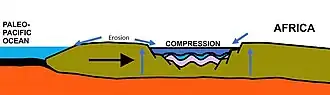 The pull-apart basin was then compressed when the Congo Craton was forced back together in the formation of the Gondwana supercontinent. This caused extensive uplift of the Owambo Basin edges and deepening of the basin's center(see Image 4), resulting in a massive erosional event that formed the Mulden Group (600-560 Ma). These three groups (Nosib, Otavi, and Mulden) compose the sedimentary package known as the Damara Supergroup.[5]