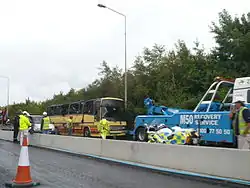 • On Thursday 10 July, a bus of forty festival-goers from Newry caught fire on a Dublin motorway en route to Oxegen. No one was seriously injured although food, clothes, tickets and camping equipment were burned in the blaze and the southbound lane of the M50 motorway had to be shut down with diversions put into place at Finglas and Ballymun, causing further traffic delays.[67][68] Those involved in the incident arrived at Punchestown in time for kick off on Friday evening, with festival organisers MCD dispatching a new bus, replacing their tickets and camping equipment and supplying food vouchers.