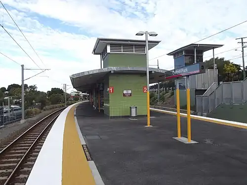 Oxford Park railway station is located on the Ferny Grove line in Brisbane, Queensland, Australia. It is one of two railway stations serving the Brisbane suburb of Mitchelton, the other being Mitchelton railway station.