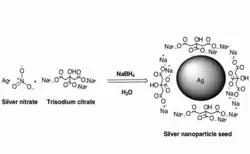 AgNPs are synthesized using microwave irradiation,[4] gamma irradiation [6] UV activation,[7] or conventional heating [8] of the precursor silver nitrate, AgNO3 using an alginate solution as a stabilizing and reducing agent.[4][9] The carboxyl or hydroxyl groups on the alginate reagent form complexes during the synthesis of the AgNPs that stabilize the reaction.[4] Nanoparticle size and shape can be specified by changing the ratio of alginate to silver nitrate used and/or the pH.[4] A coating such as PVP may be added to the nanoparticles by heating and subsequent slow cooling.[3]