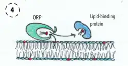 In yeast cells, some ORPs might function as sterol or lipid transporters though yeast strains lacking ORPs do not have significant defects in sterol transport between the endoplasmic reticulum and the plasma membrane.[3] Although sterol transfer is proposed to occur at regions where organelle membranes are closely apposed, disruption of endoplasmic reticulum-plasma membrane contact sites do not have major effects on sterol transfer, though phospholipid homeostasis is perturbed.[4] Various ORPs confine at membrane contacts sites (MCS), where endoplasmic reticulum (ER) is apposed with other organelle limiting membranes. Yeast ORPs also participate in vesicular trafficking, in which they affect Sec14-dependent Golgi vesicle biogenesis[5] and, later in post-Golgi exocytosis, they affect exocyst complex-dependent vesicle tethering to the plasma membrane.[6] In mammalian cells, some ORPs function as sterol sensors that regulate the assembly of protein complexes in response to changes in cholesterol levels.[7] By that means, ORPs most likely affect organelle membrane lipid compositions, with impacts on signaling and vesicle transport, but also cellular lipid metabolism.[8]